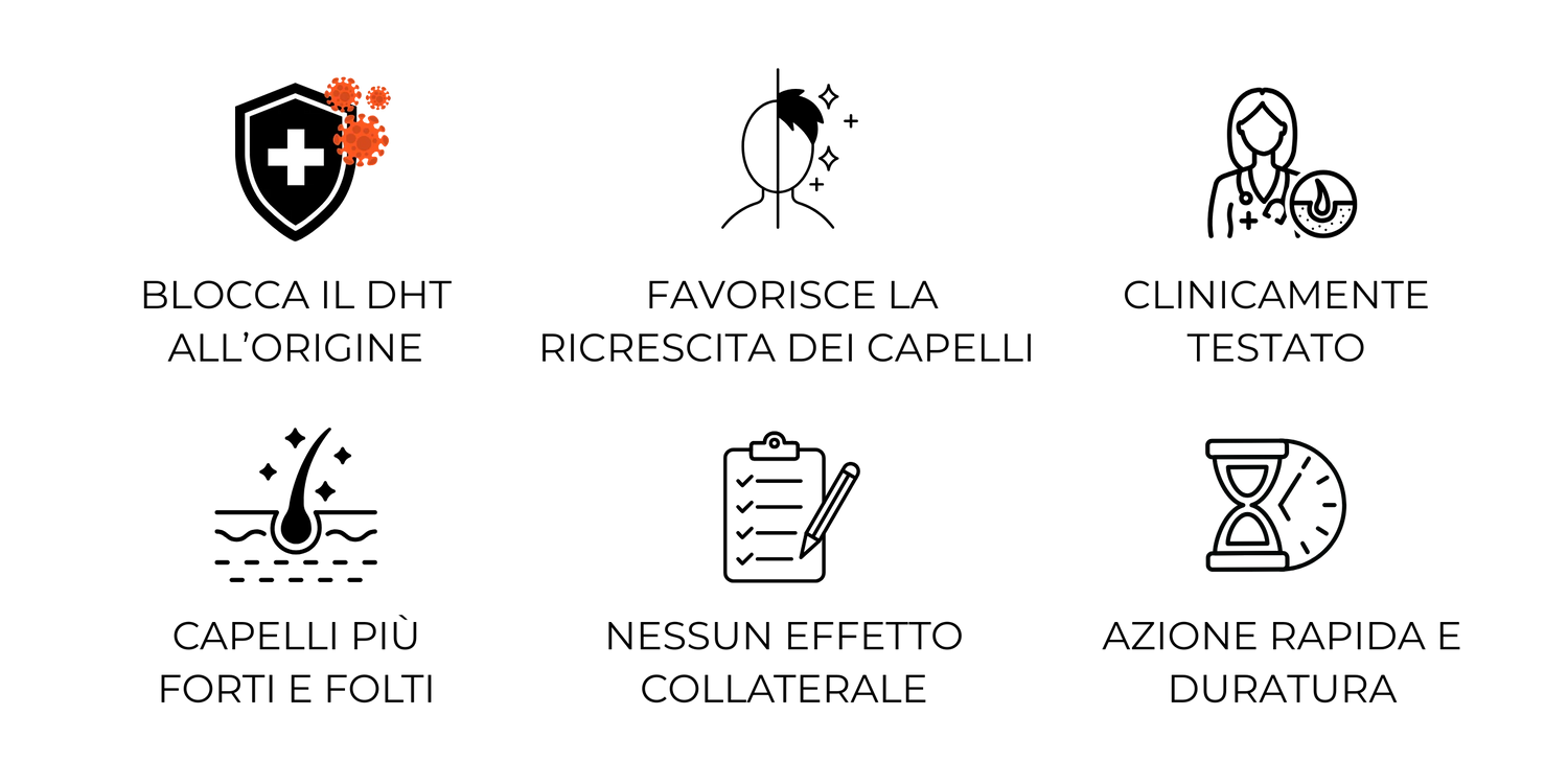 • Caffeina liposomiale: penetra nel follicolo e blocca il DHT, stimola la crescita direttamente dal bulbo, migliora la microcircolazione e stimola l'ossigenazione del cuoio capelluto.